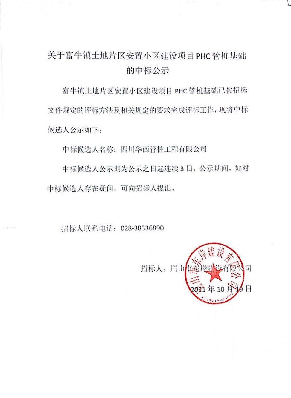 富牛鎮(zhèn)土地片區(qū)安置小區(qū)建設(shè)項目PHC管樁基礎(chǔ)項目中標(biāo)公示